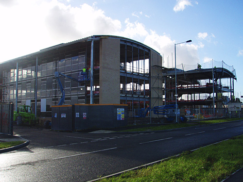 Week 22 — roof water tight and curtain walling in progress